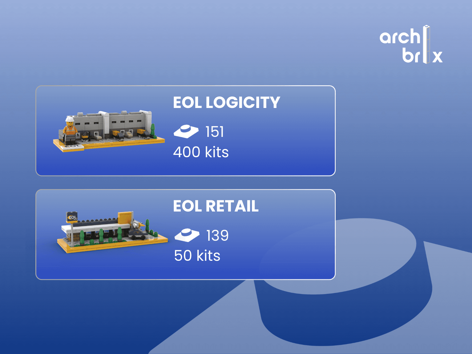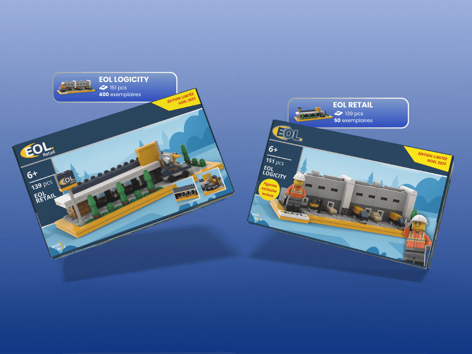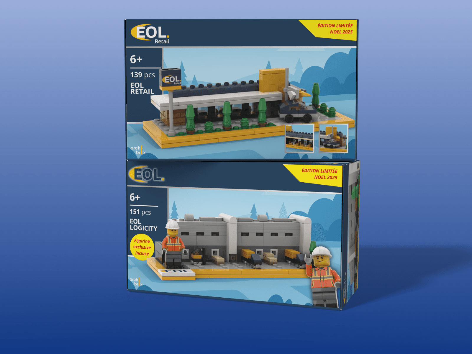 EOL, acteur de l'immobilier logistique, cherchait un cadeau client aussi original qu'ancré dans son métier. Archibrix a conçu un kit LEGO® d'un mini entrepôt logistique décliné en deux formats : une version calendrier de l'Avent, où chaque jour révèle une étape de construction sur toute la période de l'Avent, et une version kit traditionnel offerte en interne aux collaborateurs. Pour leur filiale EOL Retail, Archibrix a également créé un kit aux couleurs d'un restaurant fast-food, un objet collector au cœur de leur activité.